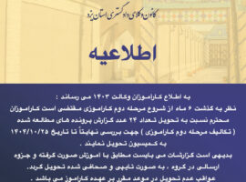 نظر به گذشت ۶ ماه از شروع مرحله دوم کاراموزی مقتضی است کاراموزان محترم نسبت به تحویل تعداد ۲۴ عدد گزارش پرونده های مطالعه شده ( تکالیف مرحله دوم کاراموزی ) جهت بررسی نهایتاً تا تاریخ ۱۴۰۴/۱۰/۲۵ به کمیسیون تحویل نمایند .