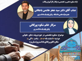 کمیسیون آموزش کانون وکلای دادگستری استان یزد برگزار می کند: ارائه مشاوره علمی و تخصصی به وکلا و کارآموزان وکالت ، با حضور جناب آقای دکتر سید جعفر هاشمی باجگانی ، عضو هیأت علمی دانشگاه ، وکیل پایه یک دادگستری و سرکار خانم شکوه پورکافی ، وکیل پایه یک دادگستری
